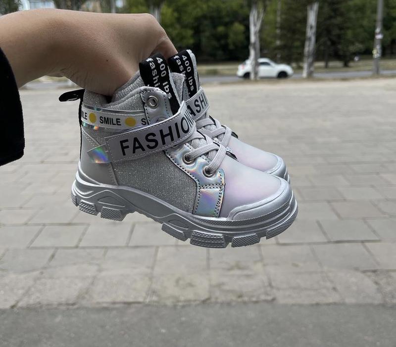 В наявності Осінні черевики з прогумованим носочком Верх шкір зам Утеплені плюшем шкіряна Устілка з супінатором ,збоку блискавка Легкі та практичні Колір срібло 28-18,3 см зацепка на фото 3