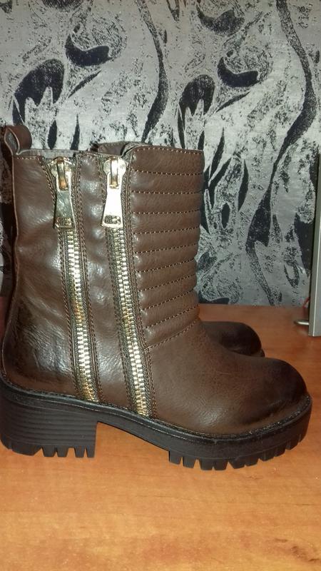 Новые осенние ботинки, тёмно коричневого цвета, заказали через интернет не угадали с размером:(, стелька 22,7см., тракторная подошва, высота подошвы спереди 2,5см., каблук 5см., высота ботинка от каблука 16см. сбоку один замок растёгивается, второй декоративный - на левом ботинке отсутствует собачка (так прислали) на декоративном замке:( - последнее фото, поэтому снизила цену:)