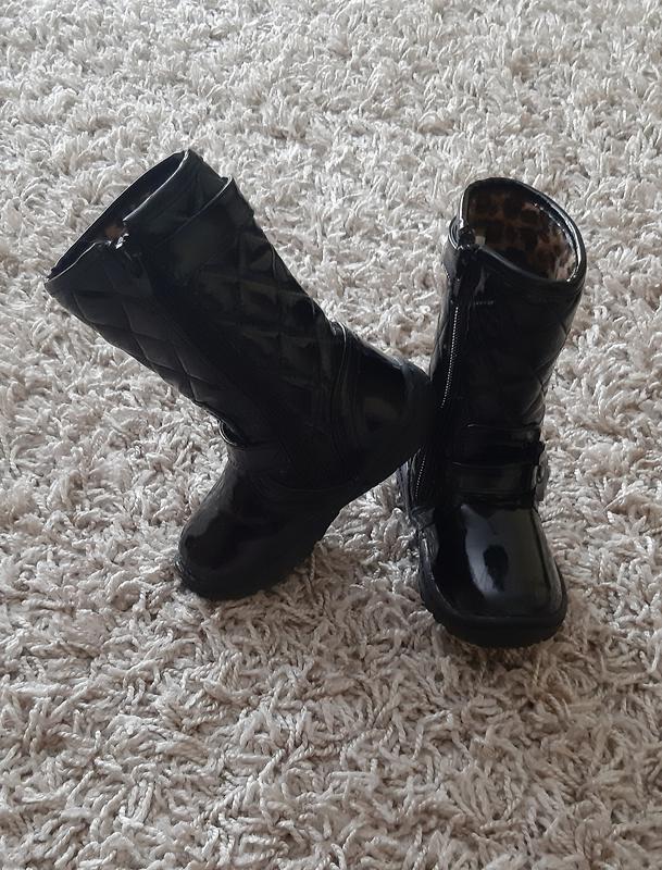 Стильні лаковані чобітки F&F. Розмір вказано 6/23, довжина стельки приблизно - 13,5см., оскільки стелька не витягується. Всередині утеплені флісом. Висота чобітка з підошвою - 16см. В дуже хорошому стані, з дефектів незначні царапини на лівому чобітку, на останньому фото вказано, при ходінні незамітно. Не на широку ногу і не на високий підйом. ☝️Відправка укр. і новою поштою по 100% передоплаті на карточку Приват Банку, якщо відправка укр. поштою, то ще +5 грн. до суми за пакування.