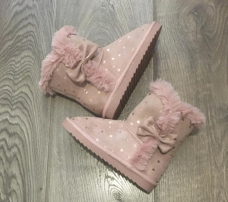Нові, без бирки.Ніжні,красиві чоботи мерехтливої кольору з маленькими блискучими сердечками .Взуття тепла, відмінної якості,фірма Primark .Розмір 27, заміри устілки на фото
