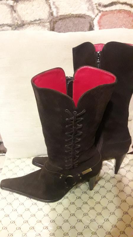 Стильні замшеві демисизонные чобітки.Довжина устілки 27 див.,ширина 9см. Висота халяви 28 див., повний обхват 32 см. Висота каблука 10 див. Дуже хороший стан. / Італія./ 40 розмір.