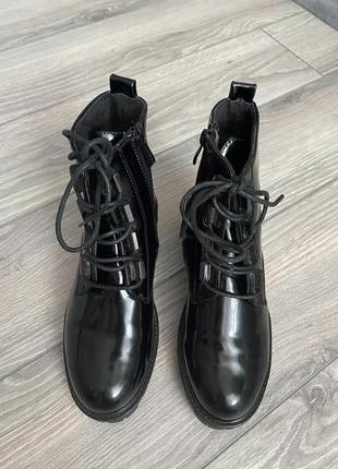 Лаковані черевики для дівчинки, із вілюрчиком всередині. Стильна шнурівка та зручна застібка. Демісезонні. Розмір 35 (устілка 22,9 см). Стан ідеальний.