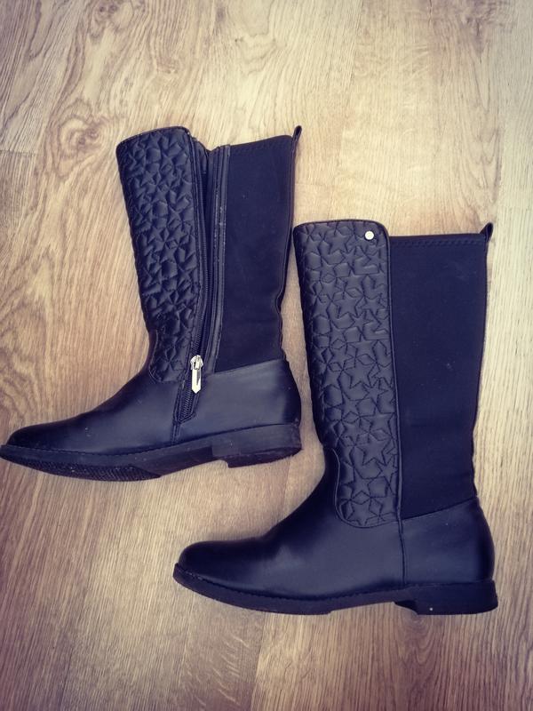 Демисезонные сапоги б/у для девочки, размер 35, стелька 22, 8 см. Легкие, удобные, на молнии, сзади резинка (подойдет на любую голень), в нерастянутом виде снизу 11 см, сверху 16 см. Высота 30 см. идеальный стан, на подошве даже рисунок в виде нового. Отлично подойдет к пальто или классической курточке на осень/ весна. Доставка НП по предоплате или безопасной оплатой