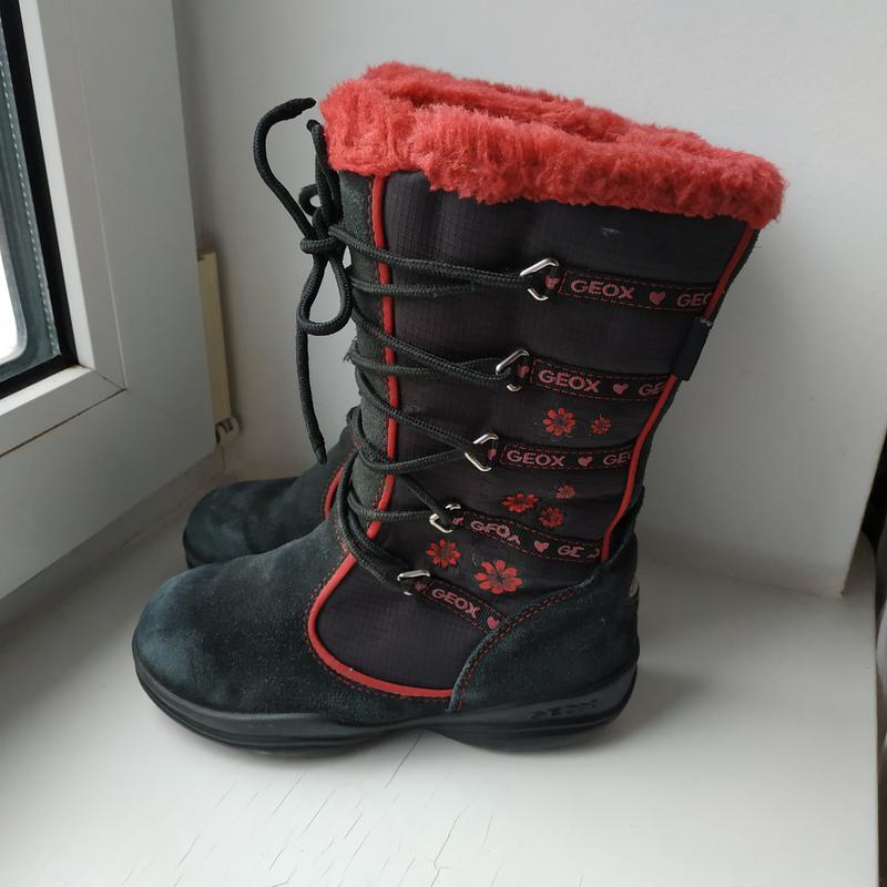 Зимние сапоги ботинки Geox 28 размер, стелька 18 см до загиба, 19 см с загибом, смотрите замер на фото. Материал верха натуральная замша, водонипроствен. В середині искусственый хутро. Застегиваются на молнию. Сверху у молнии на правом ботинке есть немного залысина. Очень хорошее состояние, чистые, без запаха.