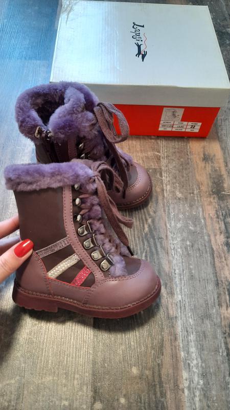 Верх натуральная кожа. Шнуровкой можно регулировать по полноте ножки. Есть и замок внутри сапога чтобы не шнуровать при каждом одевании. Внутри мех овчина. Длина по стельке -13,5см. Состояние новых. Ребенок в обуви ездил сидя в коляске.