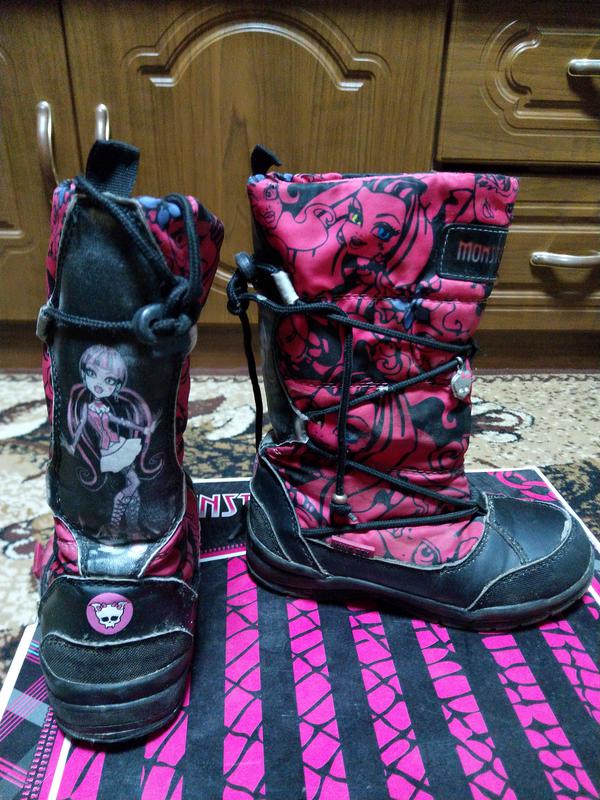 Класні фірмові термо чобітки Monster high із системою King tex. Розмір вказано 31, по устілці приблизно 19,5 (не виймається). Стан загалом гарне. На правому трохи зідрано в районі носка (дивіться фото), є потертості , але в шкарпетці особливо в очі не впадає. На п'ятах поставлена профілактика. У фірмовій коробці;)