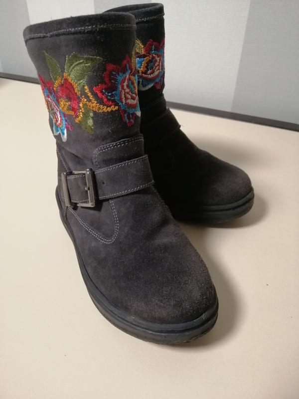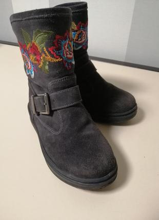 Замшевые ботинки на девочку. Тёплые, удобные и очень красивые. Полностью натуральные, внутри овчина(цигейка). В очень хорошем состоянии. Следы носки есть только по подошве, не значительные.
