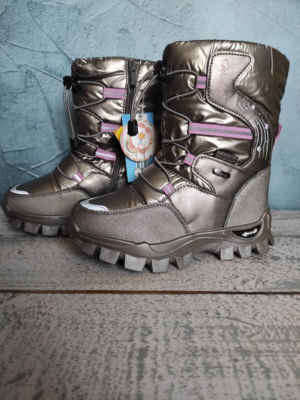 Зимние термосапожки для девочки от ТМ Том.м Верх водо и ветро непроницаемый. Внутри искусственный мех с добавлением 70% шерсти. Фиксация при помощи замка и резинки с утяжкой. Подошва с протектором (не скользят). 28 - 18,2 см