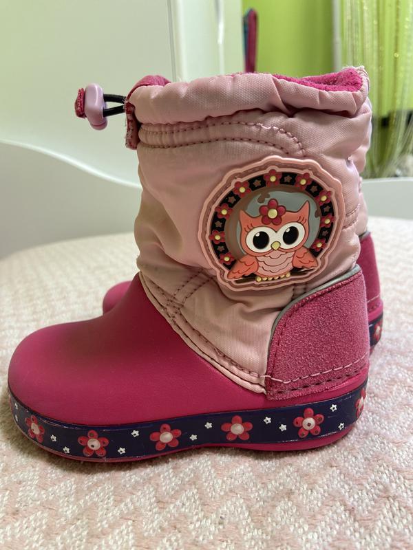 Чарівні черевички-чоботи від Crocs. Зручні, водонепроникні, легені. Всередині фліс. На температуру до -1, якщо на носок то можна довше. В мокру сльота просто незаменые черевики. І дуже гарні. Стан відмінний. На підошві де цаеточки трохи стерлося -На фото є , але абсолютно не кидається в очі так як внизу де підошва.