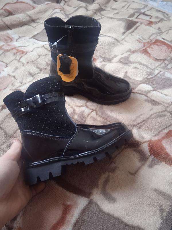 низ лаковая кожа. верх искусственная замша внутри густой и очень теплый мех. есть еще в синем цвете