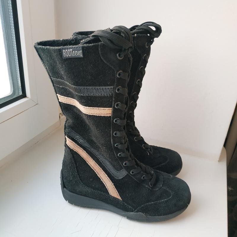 Демисезонные сапоги ROOTeens 28 размера, стелька не вынимается, 18.5 см от края до края, замерялась вручную в средине. Материал верха натуральная замша. В средине утеплены искусственной шерстью. Застегиваются на молнию. Очень легкие и удобные. Не промокают. Отличное состояние, без изьянов и нюансов.