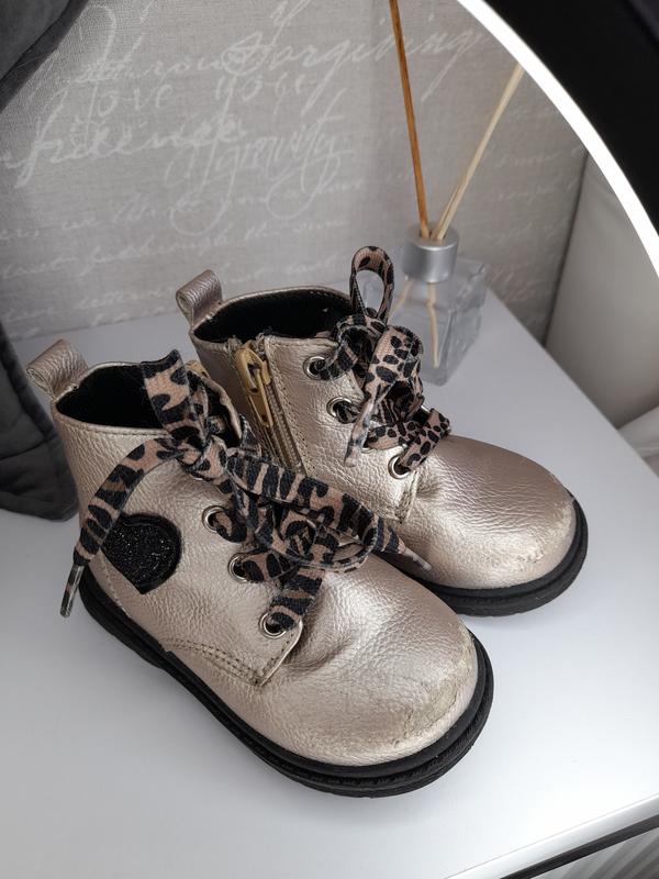 осіннє ботиночки на дівчинку ,бронзово перламутрового кольору, стан хороший ,все ідеально ,але носочки збиті ,розмір 21,по устілцв 13- 14 см