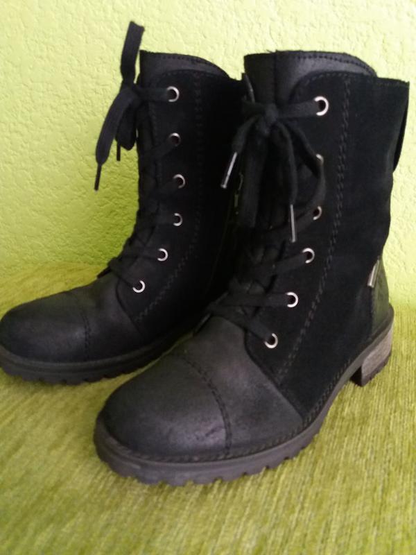 Очень красивые, прочные, неубиваемые сапоги. Верх натуральная кожа и замша. Водонепроницаемые. В состоянии новых. Без следов носки. Внутри на шерсти. Могут быть на теплую зиму. Но на слякоть - это супервещь. Есть замки. Очень классные. Размер 34. Стелька 22.5 см