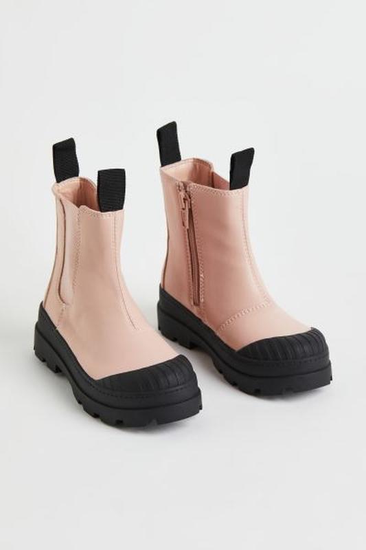 Стильні челсі від h&m. Доступні ще й в чорному кольорі. Прикрашені еластичними ґумками по боках. Всередині плюшева підкладка і устілка. Прогумований носок для кращого захисту. Застібка - блискавка. Сезонність: осінь, весна. Матеріал: шкірозамінник, поліестер, термопластична ґума. Розміри, доступні під замовлення: 24, …, 34.