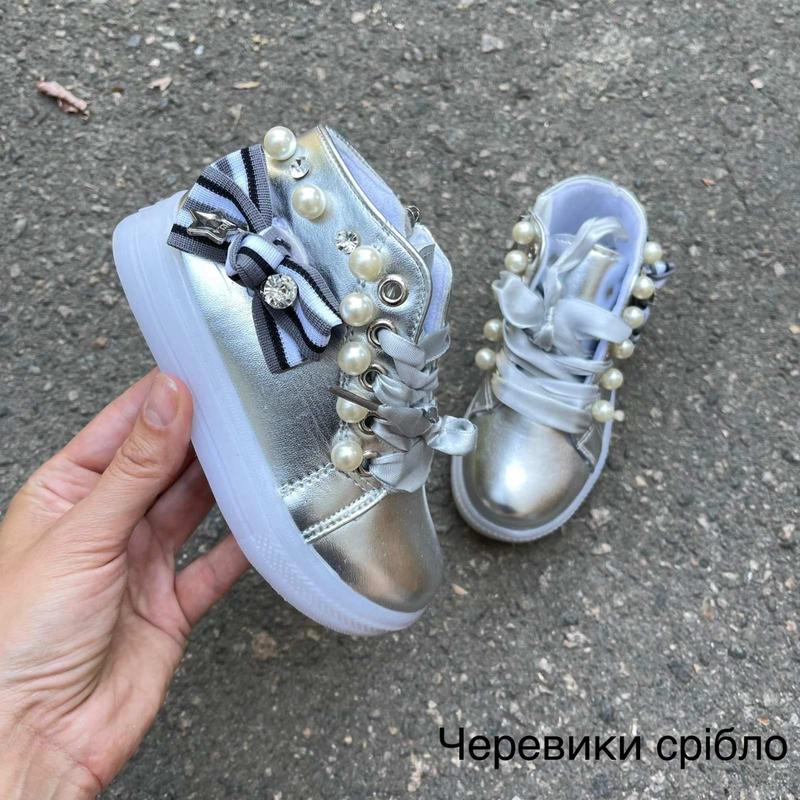 Ніжні демі черевики зі підошвою, що світиться! Відмінна якість! Осінні – утеплені флісом! Застібка-збоку змійка, спереду – шнурівка. Прикрашені з боків-перлинами, камінням та бантиком! Розміри: 21-13,**********,**********,0 30-18,0 Ціна: 425 грн допустима похибка +-2 мм