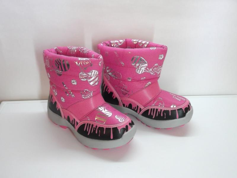 Сапожки дутики на зиму. Отлично подойдут на слякоть. Носок и задник усилен. Верх -водоотталкивающий и непродуваемый материал. Внутри -искусственный утеплитель. Подошва -TPR термопластичная резина. Цвет -малиновый р.28 длина по стельке -18см