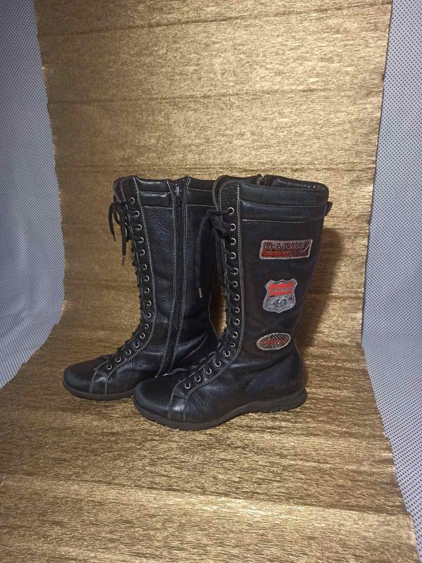 Стильні чобітки на шнурівці і блискавки. Дуже легкі та зручні. Стан на фото. По устілці 20см. Висота від підлоги 27 див. Демі. Натуральна шкіра.