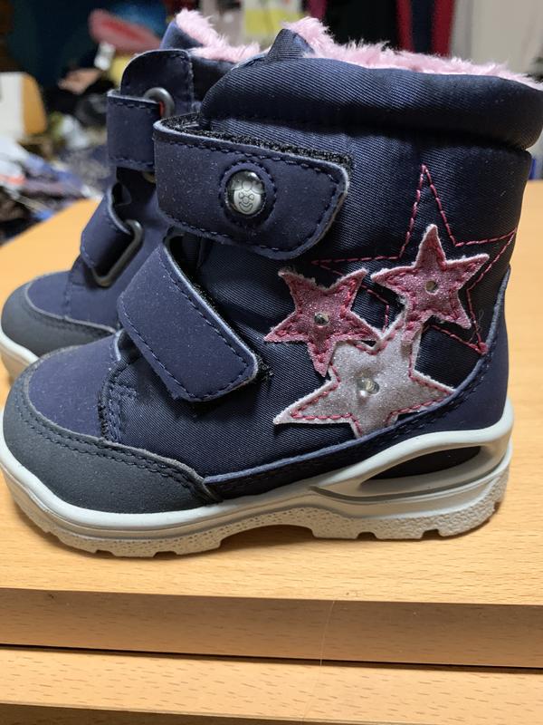 Симпатичные сапожки на девочку, размер 20, на надежной плотной, но Легкой подошве, утепоены искусственным мехом, в звездочках загораются лампочки при ходьбе .Италия, новые.