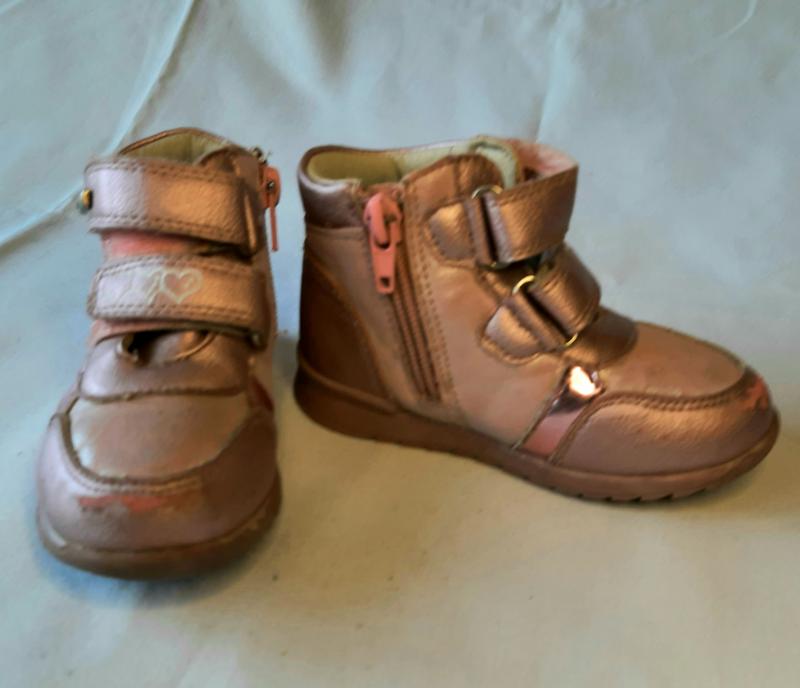 Спортивные сапожки - сезон весна/осень (без утепления). Застегиваются сбоку на молнию, а впереди - на две липучки. Впереди чуточку потертые. Подошва не скользкая. Размер потолки - 14см. Материал- кожзаменитель, потолка- кожаная.