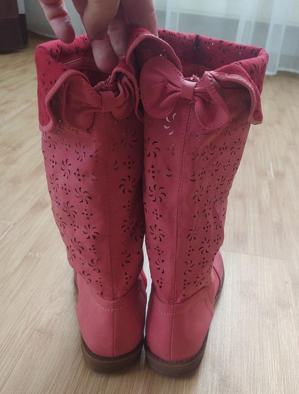 Продам новые осенне-весенние сапожки 33 и 34 размеров. Выполнены из искусственной нелакированной кожи, имеют ажурную перфорацию. Материал обладает легкой бархатистостью. На подошве маленький каблук. Очень красиво смотрятся на ножке. Стелька не вынимается, поэтому трудно сделать замеры, но если нужно, то буду как-то измерить. Длина 34 размера по подошве 22,8 см, высота с завернутыми голенями 29-30 см. Дам все дополнительные фото, видео и замеры.