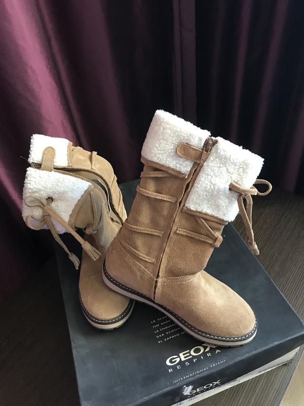 Сапоги GEOX, удобные и стильные, на молнии, подойдут на любую полноту! Верх - замша Внутри - искусственный мех Сезон - зима 31размер по стельке 20см Есть 2 небольших пятна от клея, шестняя фото,высота сапога 21 см