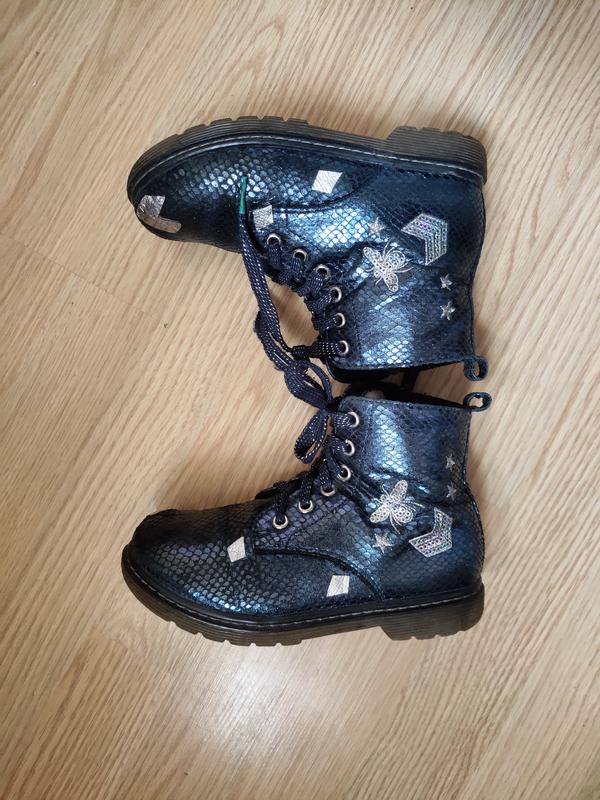 Деми ботинки для девочки ТМ Сказка. Верх - экокожа. Утеплены текстилем. На молнии. Размер 30 , стелька 19.5 см Декорированы латками из натуральной кожи. Фото на ноге нет . Замки целые .