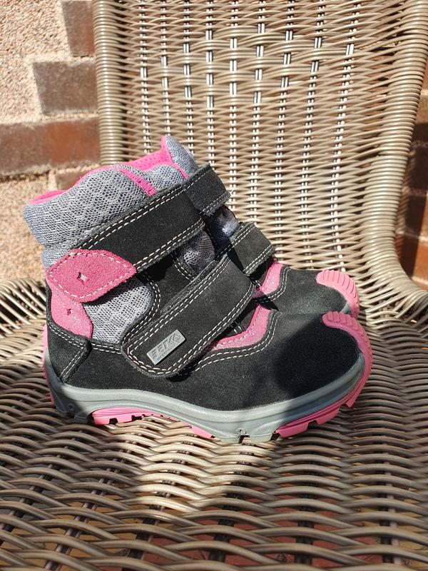 Ботинки с яркими розовыми вставками для девочки Bartek. Модель выполнена в красивых цветах, декор в виде ярко-розовых вставок. Способ застегивания липучка. Качественные и теплые ботинки для холодной зимней погоды. В хорошем состоянии! Страна: Польша Сезон: Зима Верх: замш натуральный Подшивка: мембрана BRTKtex Стелька: вовна Подошва: TR-термокаучук Способ закрытия: липучка Стелька 16см