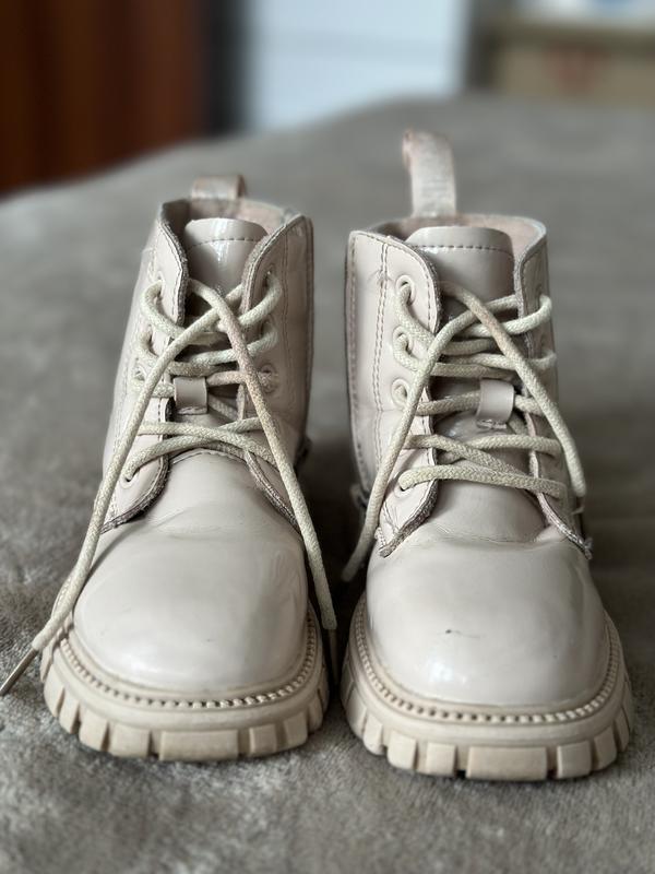 Демисезонные сапожки для девочки. Выполнены из лакированной эко-кожи. Утепленные офисом, легкие и гибкие. Сбоку замочек, работает отлично. Размер по утельцу-16см Размер – 26. На фото видны все недостатки. Присутствуют незначительные мелкие царапинки. Они не влияют на холодо- или водопроницаемость. Присутствует царапина на левом сапожке (фото). Видно также вверху на язычке отсутсвует фрагмент экокожи. Когда зашнурованы-не видно. На правом сапожке по внутренней стороне чуть-чуть отходит кожа от подошвы, не течет, осторожно можно подклеить (последнее фото)
