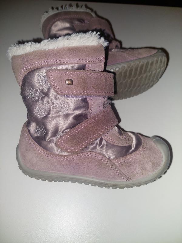 Сапожки для девочки немецкой фирмы Elefant. Натуральная замша и плащевочка. Штучне хутро. Застежки - две липучки,котри зафиксированы, поэтому не будут провисать. Легкие и удобные, качественные. По устілки 14 см.