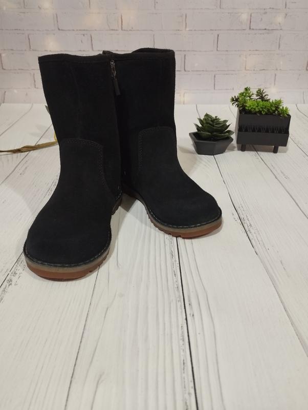 Чобітки фірми ugg оригінал в чудовому стані розмір 27.5 довжина устілки 17 см Дитячі черевики від бренду UGG Australia чорного кольору відрізняються легкістю, зручністю і легендарним привабливим дизайном. Виконані з першокласної замші класу А для захисту від морозу і втоми. Запатентована підошва забезпечує чудову амортизацію, оптимальний комфорт і запобігає ковзанню. Устілка з натуральної овчини. Сезон осінь,євро-зима)