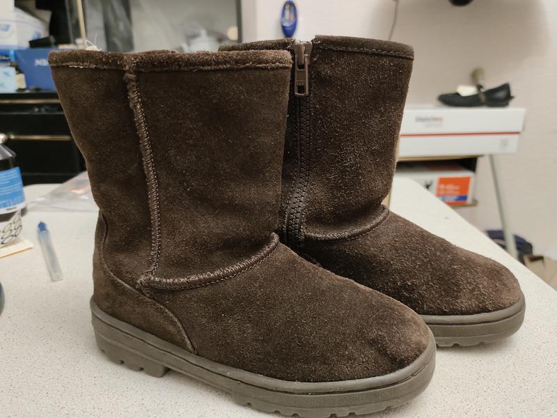 Пропоную дуже гарні дитячі чоботи, легкі, теплі та м'якенькі. Виготовлені з натуральної шкіри (замш), утеплені пухким м'якеньким штучним хутром. Для зручності вшита блискавка, мають міцну, не слизьку термопластичну підошву. Взуття чистеньке, без сторонніх неприємних запахів. Довжина устілки 18 см, висота чобіт разом з підборами 18 см, окружність угорі 24 см. Дефекти відсутні. Арт. 0089