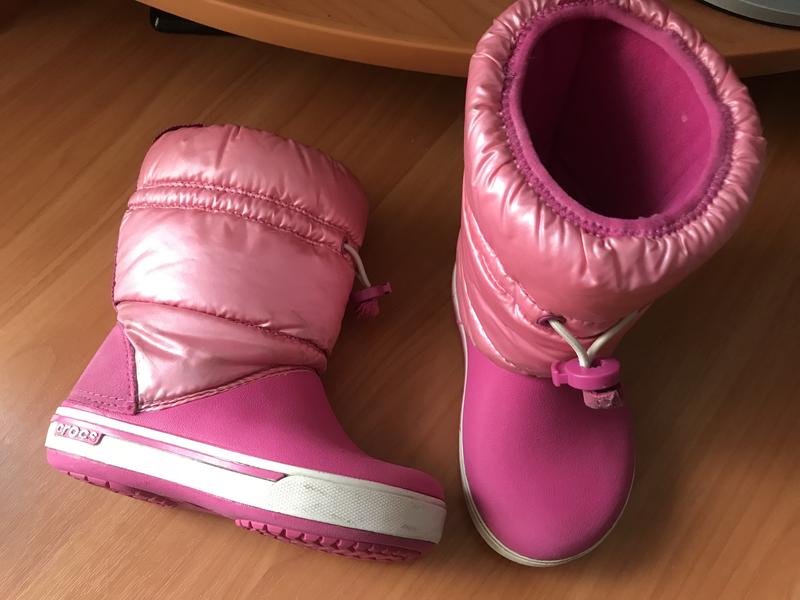 сапоги crocs C 9 наш 25-26 Устілка 16 см. Рекомендовано на ножку 15-15,5 см. Розовые, теплые, вместимые. На мокрую зимнюю погоду отлично подойдут. На сильные морозы могут быть с теплыми носками. Они вместимые, поэтому грубый носок зайдет. Состояние отличное. Полностью соответствуют фото. Баллон в некоторых местах не идеально чистый, но это не заметно совсем.