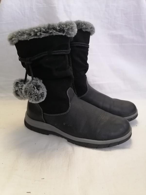 Сапоги на девочку из искусственной кожи и текстиля, отделаны мехом. Внутри мягкий искусственный мех. Немного примяти носики от хранения, а так цельные. Написанный размер 36, длина стельки 23 см. На все вопросы с радостью ответят, при необходимости пришлю дополнительные фото и замеры.