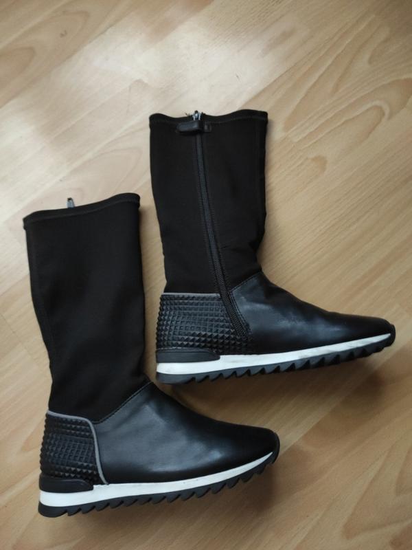 Очень классные сапожки из натуральной кожи, верхняя часть- эластичный плотный текстиль. Ортопедические кожаные стельки. Состояние отличное, носили мало. Есть небольшая царапинка, но поверхностная, кожа не повреждена, кремом замажется, в остальном- идеальное состояние. Очень красиво на ножке смотрятся. Стоили 100 евро.