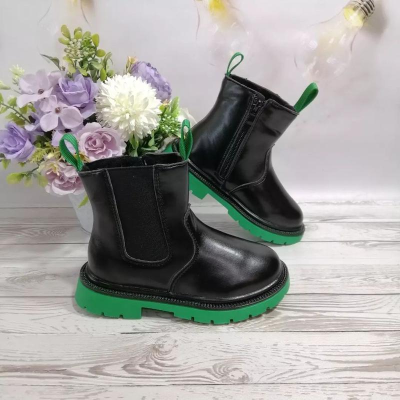 Демісезонні чобітки з еко-шкіри, утеплені велюром. Застібка - молнія. Підошва гнучка. Чобітки легкі, зручні, м'які.