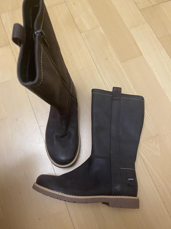 Детские сапоги темно - коричневого цвета 31 размера. Бренд Clarks. Стелька 21 см, ширина стельки 7 см, высота 23 см, обхват 30,5 см. Новые, без дефектов, до разграждения цена 58 фунтов.