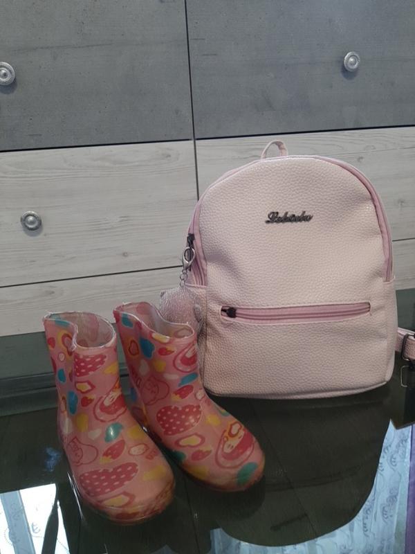Розовые с рисунком цветных сердечек сапожки.