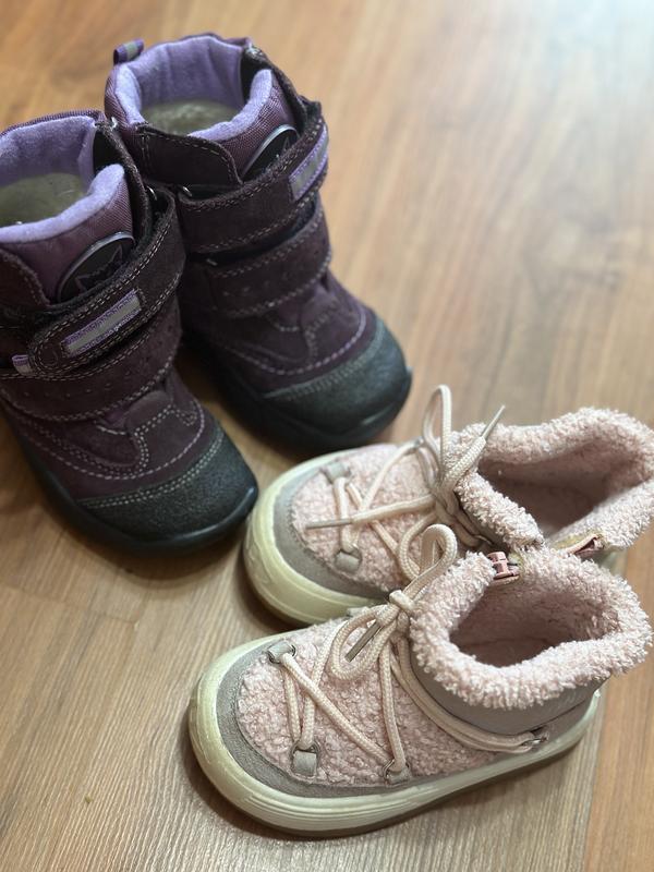 2 пары зимних сапожков на разную погоду - розовые на сухую, фиолетовые красиво подходят на мокрый снег. Розовые очень мягкие, гибкие.