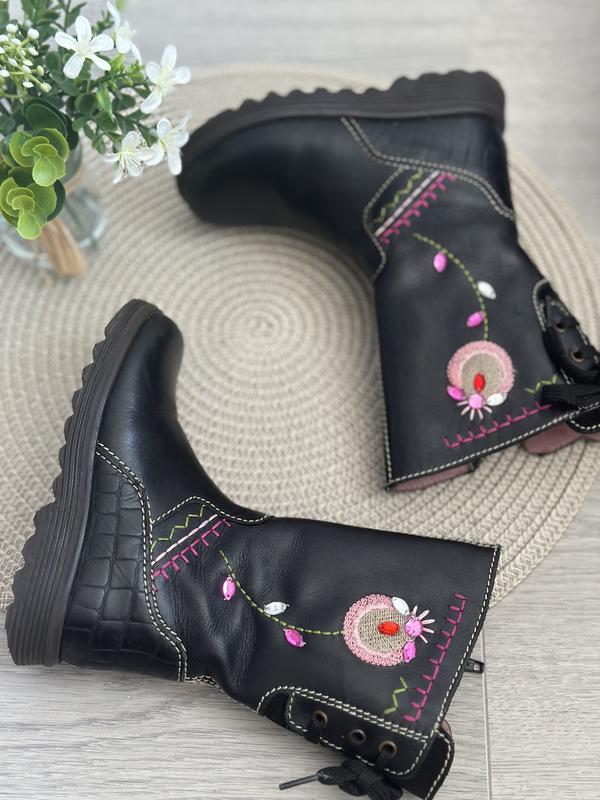 Очень красивые кожаные сапожки от Chicco Сочетание вышивки, камушков, двух типов кожи Одели несколько раз ( видно по подошве и стельке) Но успели зацепить носочки (см.фото), при носке будет не заметно