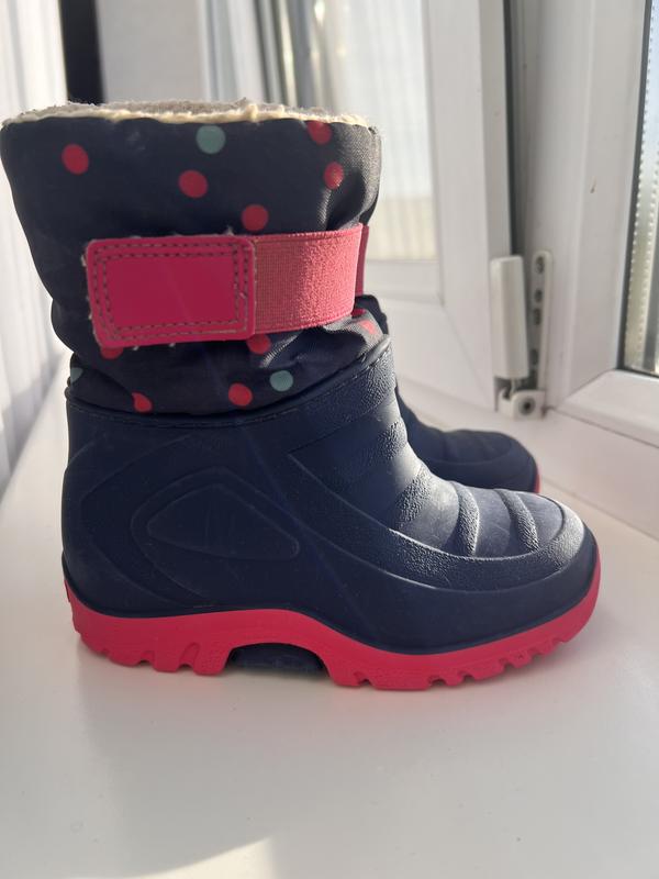 Гумаки з утепленням (утеплення збите) на осінь. Для дівчинки. Чинні з яскраво рожевим.Гарно фіксують ніжку. Довжина по устілці 14,5 см на ніжку 13,5-14 см. Були в активній носці, тому ціна відповідна.