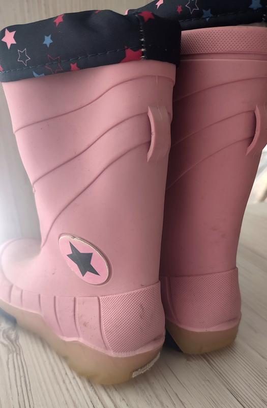 Резиновые сапожки в хорошем состоянии. Удобные для ножки, имеют съемное утепление. Среди дефектов – потертости (вывно на фото) и легкое выцветание цвета. У дома по лужам можно бегать без проблем
