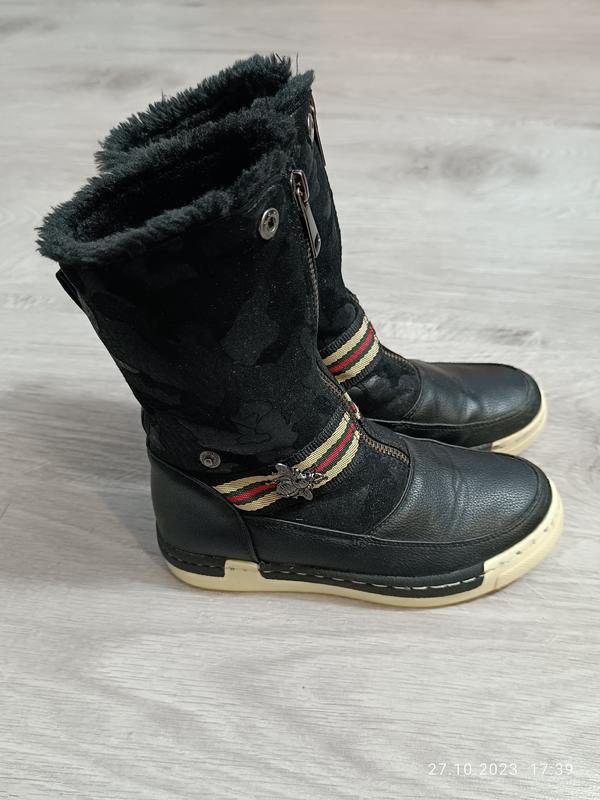 Очень красивые, теплые сапожки трансформер. Очень удобны благодаря тому, что можно носить под юбочку в виде сапожки, а также отвлечь и застегнуть на кнопочки и носить под штанишки в виде сапожек. Такой себе вариант 2/1 Состояние хорошее. Размер 33 Стелька 21см