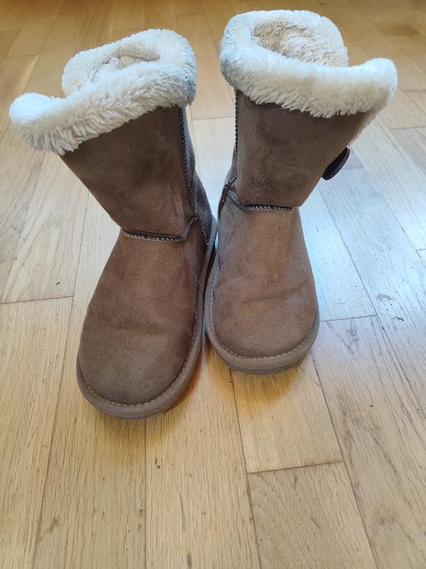Угги зимние,на девочку. В коричневом цвете,размер 34. Можно защелкивать на пуговицу, или делать отворот.Без повреждений, мех искусственный.
