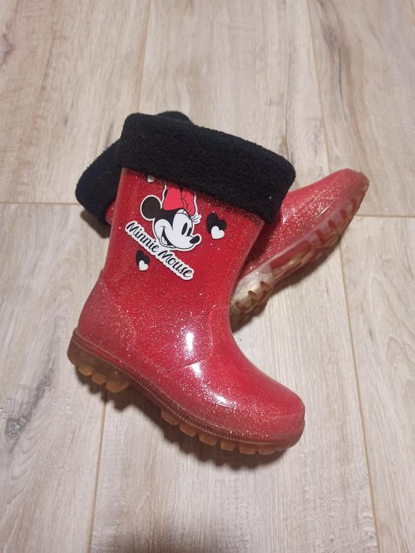 Очень красивые резиновые сапожки в идеальном состоянии. При ходьбе светятся. Очень красиво моются. лесное утепление вынимается - можно носить летом на мокрую погоду. на ножку от 14 до 15.5 см. То есть где-то с 2 до 4 лет.