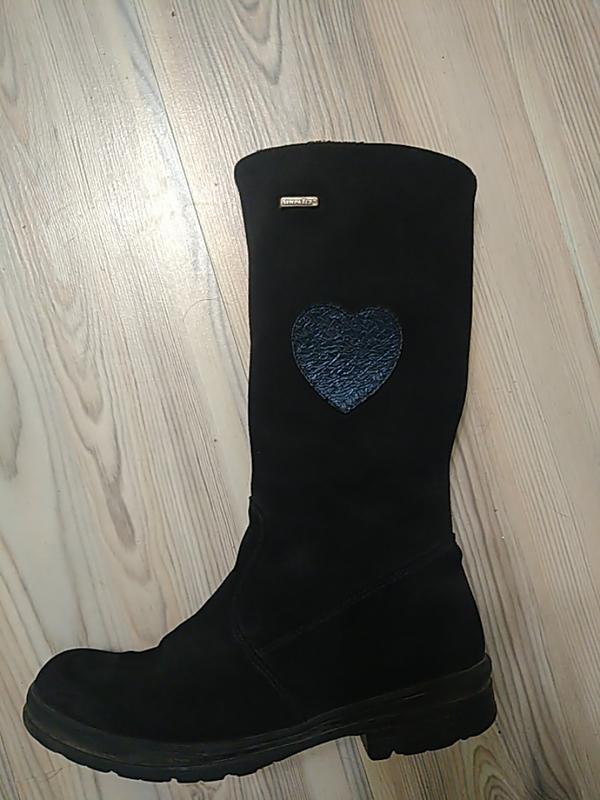 Шикарные сапоги на девочку.Не промокают(sympa tex мембрана), бритвинок от затекания,тепленные, не скользкие.Очень стильно смотрят.Размер 34, стелька не вынимается,по подошве 24 см.