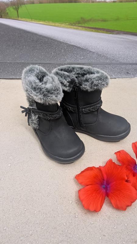 Новые ботинки, украшенные мехом, внутри флис. Стелька 13 см +- 2 мм, не достается. Размер 21.
