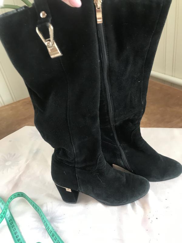 Жіночі чоботи сезон весна -осінь , натуральний замш , висота каблука 4 см, на змійці , в дуже хорошому стані, розмір 36 довжина стільки 23 -23,5 см, чорного кольору