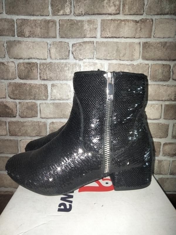 Эффектные ботинки от River Island. Полностью из пайеток. Застёжка молния с внутренней стороны ноги, с внешней стороны декоративные. Размер 1, наш 33. Длина стельки 20 см. Высота каблука 2.5 см. Высота ботинка 15.5 см. Были обуты один раз, следов носки нет. Смотрите и другие мои объявления. Пересылаю