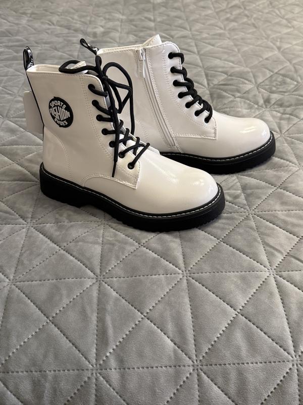Демісезонні ботинки для дівчинки Kimboo Стильні лаковані ботинки білого кольору. Модель утеплена всередині, підійде для прохолодної осені чи весни. Зручна підошва, практичні у догляді, гарно поєднуються як з повсякденним, так і зі святковим одягом. ✅ Фірма: Kimboo ✅ Матеріал верху: еко шкіра ✅ Усередині: утеплені ✅ Стан: нові Розмір: 35 ( устілка 22 см)