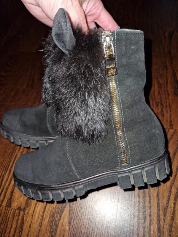 сапожки осень- зима на меху, очень мыло смотрятся на ножке. безposансов. спереди натуральный кроличный мех, милые ушки. из натуральной замши. длина стельки 20 см.